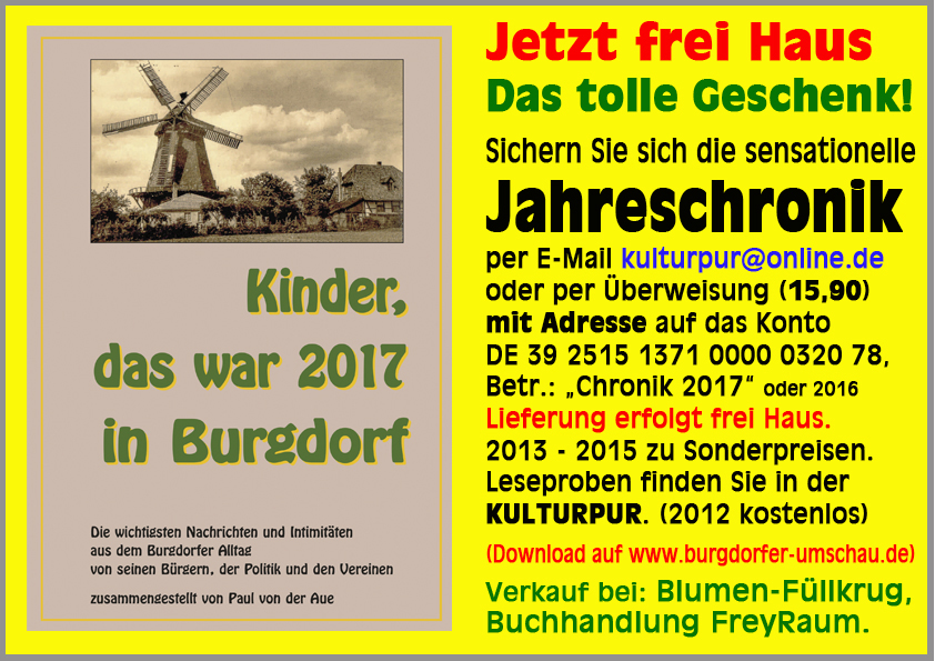Burgdorf. Rechtzeitig zum Weihnachtsfest ist die druckfrische hochaktuelle Jahreschronik »Kinder, das war 2017 in Burgdorf« zum Preis von 15,90 Euro eingetroffen. Der einmalig niedrige Preis erklärt sich durch die ehrenamtliche kostenlose Zuarbeit aller Beteiligten. Die Herausgabe erfolgt ohne Werbeanzeigen und irgendwelche Zuschüsse, um unabhängig zu sein.