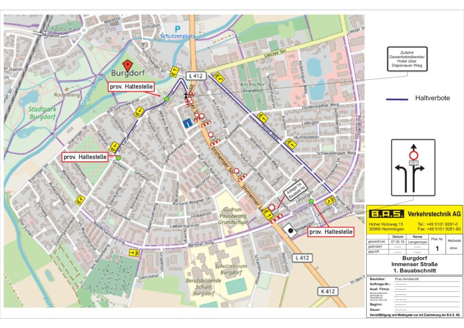 Ab Montag, 20. Mai, beginnen die Bauarbeiten in der Immenser Straße/Immenser Landstraße (L412). Aus diesem Grund wird die L412 von der Zufahrt zur Dammgartenstraße bis zum Ostlandring voll gesperrt und der innerstädtische Verkehr über den Peiner Weg umgeleitet. Die Dammgartenstraße bleibt jedoch befahrbar.