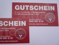 Die Gutscheine können das ganze Jahr 2014 über gegen die neuen Restabfallsäcke eingetauscht werden – allerdings nur auf den aha-Wertstoffhöfen und im Einzelhandel. Die zusätzlich angemieteten Ausgabestellen in den Städten und Kommunen werden nach sechs Monaten zum 1. April 2014 wieder aufgegeben, da die Nachfrage zunehmend abebben dürfte. aha geht davon aus, dass das Gros an Säcken bis dahin einge-tauscht worden ist.