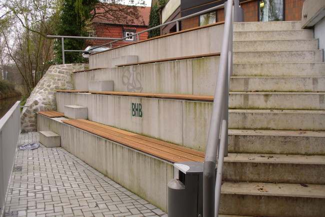 Die Stadtoberen von Burgdorf (Region Hannover) wollten die Uferbereiche der Aue – ein kleiner Nebenfluss der Aller – aufwerten und die Zugänglichkeit verbessern. Auf Höhe der Braunschweiger Straße kam dabei eine völlig verunglückte Treppenanlage heraus, die aus steil angeordneten Betonblöcken auf engstem Raum besteht. Wer sich auf eine der vier Stufen setzt, kriegt wortwörtlich keinen Fuß mehr auf die Erde, denn die Stufenabstände sind viel zu groß geraten. Um die kalten Sitzflächen ein wenig komfortabler zu gestalten, wurden nachträglich noch Holzbohlen verlegt. Genutzt hat das alles nichts. Für Bürger und Besucher der Kleinstadt nordöstlich von Hannover ist die Anlage alles andere als einladend. Dafür sorgt auch der unschöne Ausblick auf die gegenüberliegende Uferbefestigung aus Beton. Die Anlage hinterlässt somit einen kümmerlichen Eindruck, was durch die schon bald einsetzende grünliche Verfärbung des Betons noch verstärkt wird. Mit der im August 2013 fertiggestellten Treppenanlage hat die Stadt rund 42.000 Euro Steuergeld in den Sand gesetzt.