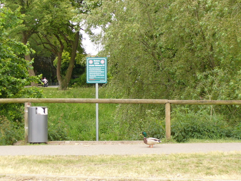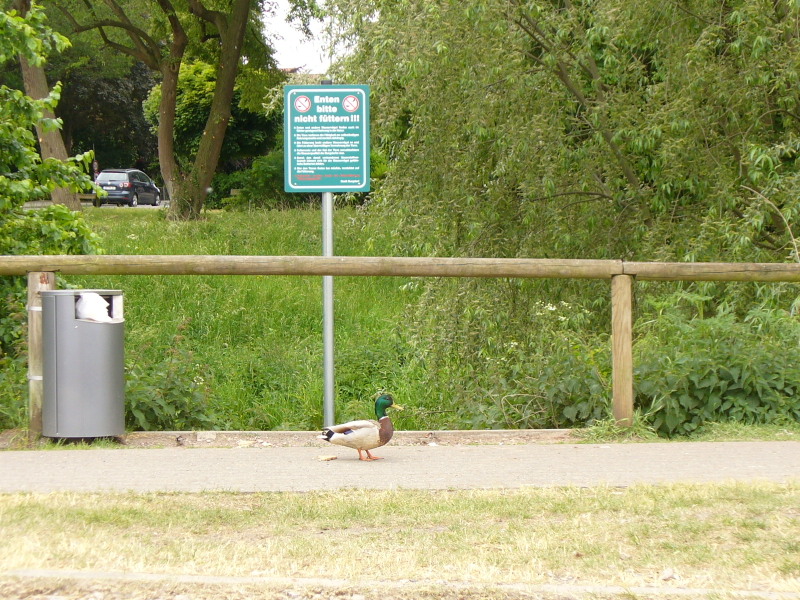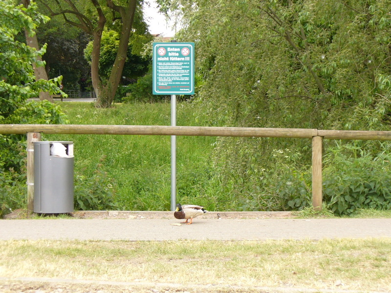 Burgdorf/Aue/Pferdemarktplatz. Die Stadt Burgdorf hat heute weitere neue Schilder im Stadtgebiet aufgestellt, diesmal an der Burgdorfer Aue. Auf grünen Hinweistafeln bittet die Stadt darum, die Entenfütterung zu unterlassen. In kräftigen rot wird darauf hingewiesen das durch Fütterungsreste auch Ratten und weitere Wasservögel angelockt werden, was zu einer übermäßigen Vermehrung der Tiere führt. Futterreste und Kot verschlechtern außerdem die Wasserqualität der Aue, so die Stadt.