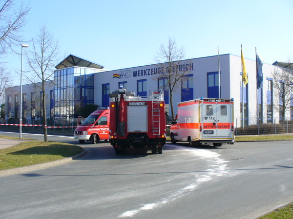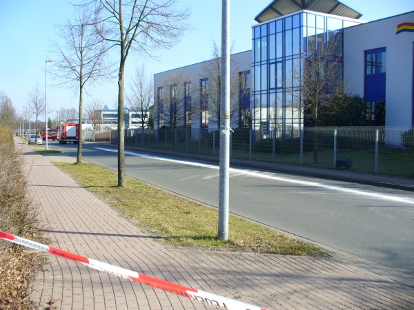 Vollsperrung der Färberstraße durch FeuerwehrFärberstraße im Gewerbegebiet HülptingsenÖlspurbeseitigung durch Fachfirma (Kreuzung Lidl)