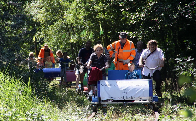 Unterwegs mit der DraisineIm Juli 2007 gründeten einige Eisenbahnbegeisterte den Verein Kleinbahn Wathlingen Ehlershausen. Im Volksmund Kalibahn genannt hatte es der Verein nicht leicht, sich gegen allerlei Widerstände durchzusetzen. Mit Beharrlichkeit und Zielstrebigkeit schafften es die Mitglieder aber doch, und in diesem Jahr gibt es den rührigen Verein seit 10 Jahren.
