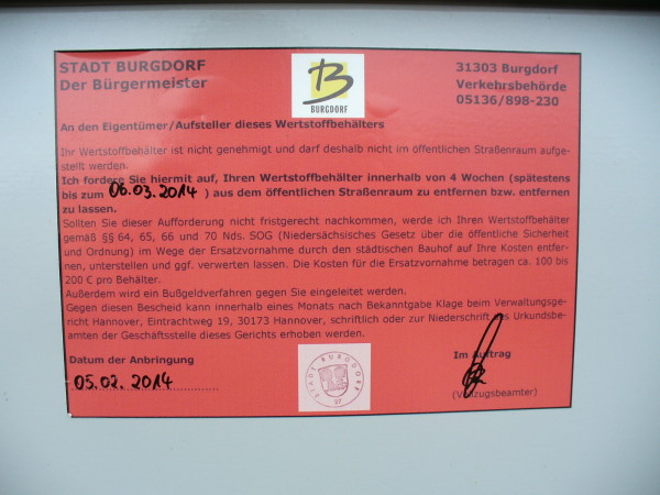 nicht genehmigter Sammelbehälter (links)Aufforderung zur Entfernung des Containers