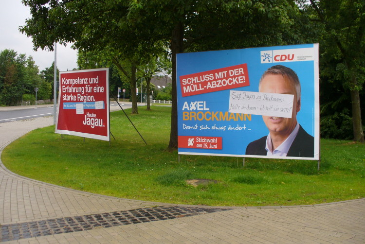 In Teilen des Stadtgebietes sind heute die Wahlplakate von unbekannten mit Parolen überklebt worden. Das ist weder schön, noch rechtens. Jeder hat die Gelegenheit sich direkt an die Parteien und ihre Kandidaten zu wenden. Die Region als Gebilde ist gescheitert und reißt alles mit runter. Das Vertrauen in die ortsferne Politik ist am Boden. Wer etwas verändern will muss Wählen und nicht nur Sprüche kleben. Das System ist nicht für, sondern gegen den Bürger ausgelegt und kann leider nur durch die (sogenannten) Volksvertreter verändert werden. Ein „weiter so“ bedeutet Stillstand für die nächsten Jahre, was keiner so richtig wollen mag. Darum heißt es zunächst erst einmal abwählen, damit die Arroganz nicht noch mehr ausufert. Des Weiteren sind die Amtszeiten zu verkürzen und als Präsident kann nur eine Verwaltungsfachkraft eingestellt werden. Das spart Kosten und Zeit. Auch sind die Bürger in Entscheidungen einzubeziehen, die ihr direktes Lebensumfeld betreffen! Haftung und Korrektur von Fehlentscheidungen müssen geregelt werden! Wir müssen wieder Weg vom Zentralismus und der Diktatur durch Behörden zu mehr Demokratie und mehr Menschlichkeit finden!