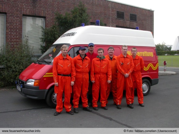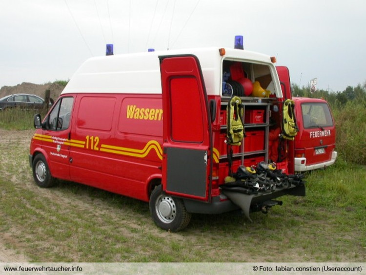 Aber es sollte noch besser kommen. Das 1978 als Wasserrettungsfahrzeug in Dienst gestellte Fahrzeug war nicht mehr verkehrssicher, ein Nachfolgefahrzeug nicht in Sicht. So wurde die ganze Beladung in Paletten verbracht und musste so in den Einsatz gehen .Ein Umstand der sich zum Glück nur über eine Winterpause hinzog. Im März 1998 konnte dann Entwarnung gegeben werden. Ein Ford Transporter mit Hochdach wurde übergeben und durch Eigenausbau (Dank an den Gerätewart Wilfried Schiefler) nach Erfahrungswerten aus der Praxis ausgestattet.