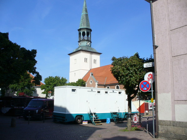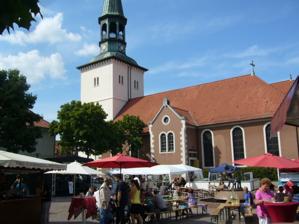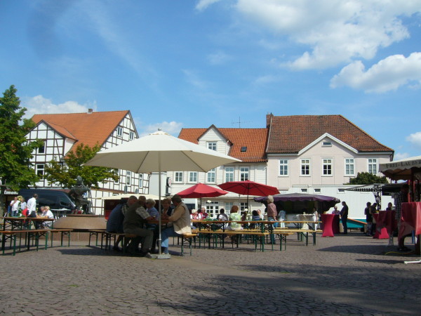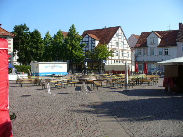 Zur Begrüßung der Gäste aus Richtung Schützenplatz stellte man unübersehbar einen großen Toilettenwagen in den Eingangsbereich.An der Marktstraße hing ein gemaltes Pappschild mit dem Hinweis auf das Weinfest, welches hinter einem Fischwagen stattfand. Aus Richtung Schloss wurde man durch Grillgeruch empfangen. Wen das alles nicht störte, der konnte es sich auf einer der Sternförmig um den Wickenthiesbrunnen aufgebauten Sitzbänken gemütlich machen. Auf das wohltuende plätschern des Wassers musste man aber verzichten, ist ja schließlich ein Weinfest!